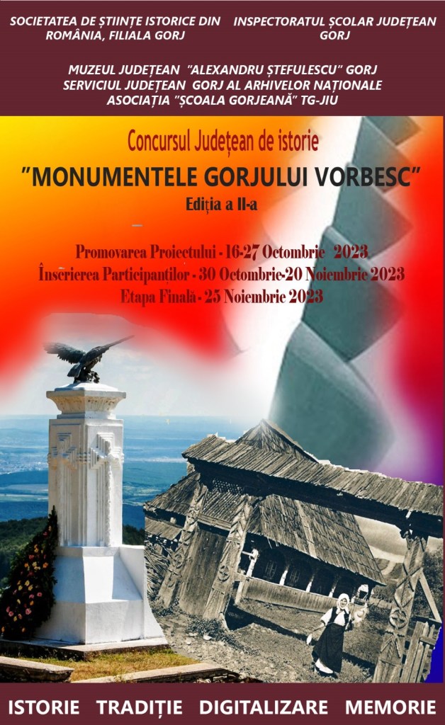 Pentru al doilea an consecutiv, Filiala Gorj a Societății de Științe Istorice din România și Inspectoratul Școlar Județean Gorj, în parteneriat cu Muzeul Județean ”Alexandru Ștefulescu” Gorj și Serviciul Județean Gorj al Arhivelor Naționale, derulează Concursul Județean de Istorie ”Monumentele Gorjului vorbesc”. Sunt așteptați elevi de Gimnaziu și Liceu cu filmulețe despre cele mai interesante monumente din județul nostru și cu bagajul de informații existent.
